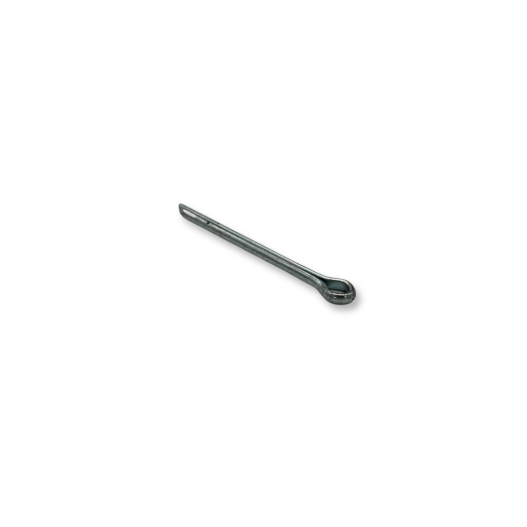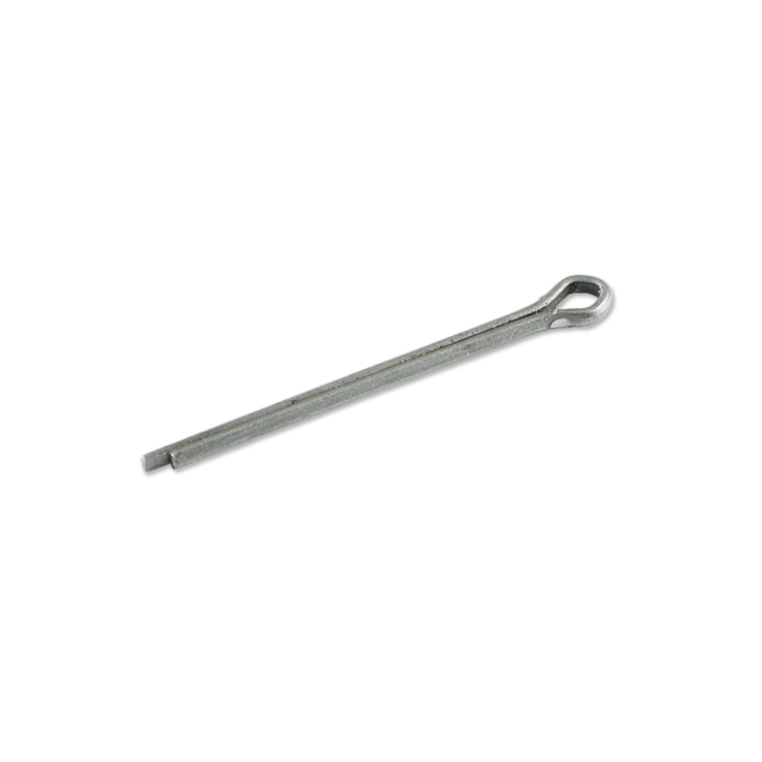 This standard cotter pin is an essential mechanical fastener, constructed from durable and affordable carbon steel (an iron alloy with up to 2% carbon) that is coated with a thin, externally applied layer of zinc plating to provide crucial corrosion resistance and a slight color tint. The pin functions by being inserted crosswise through a shank or shaft, where it is secured by bending the tines outward, effectively preventing objects from sliding off or keeping clevis pins from pulling out.